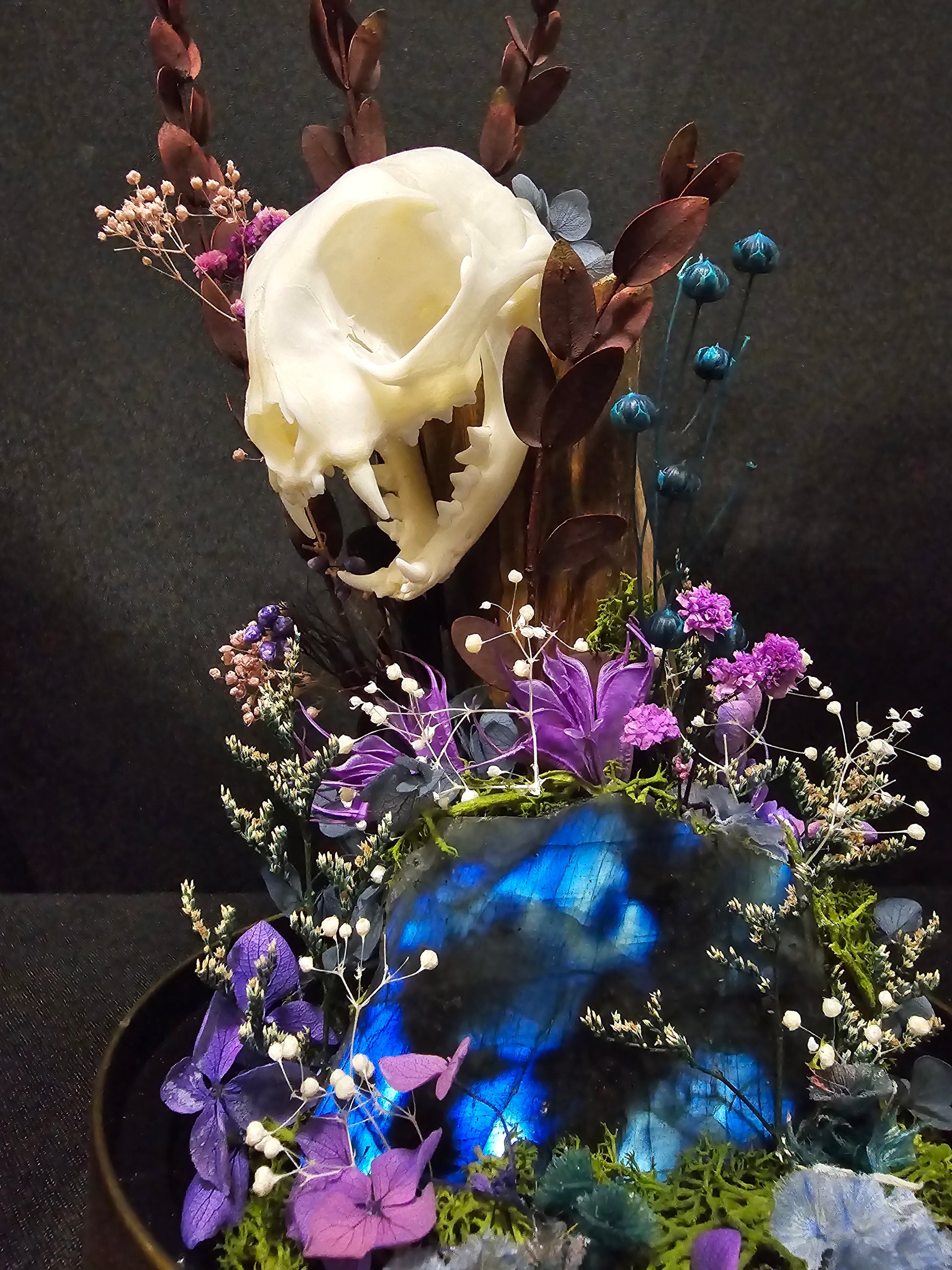 A glass dome terrarium housing a real cat skull, a labradorite slab and preserved flowers based on heat treated wood.